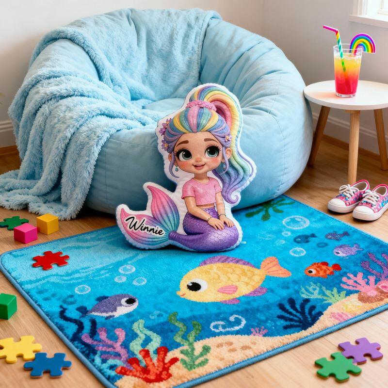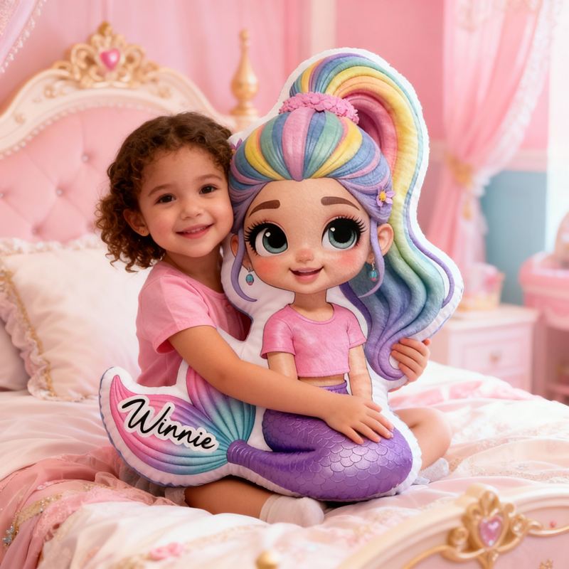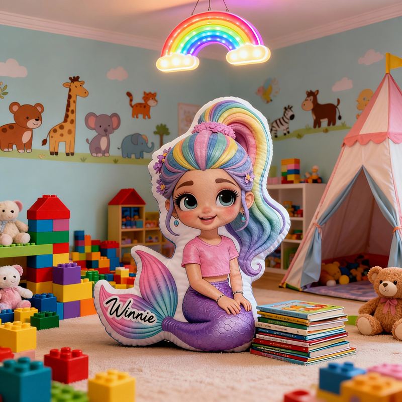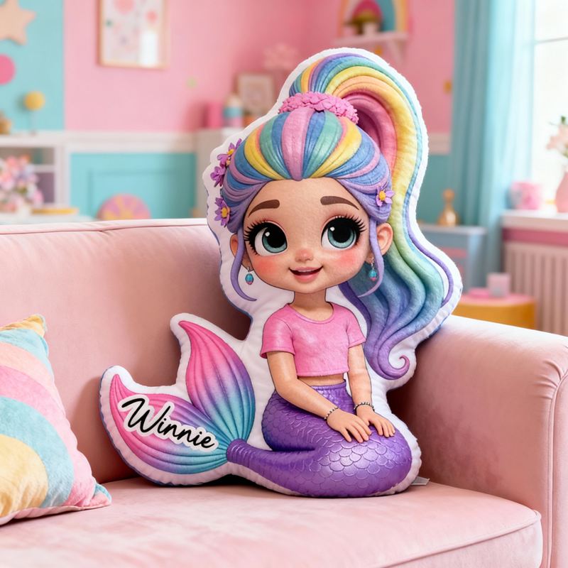 Personalisiertes Kissen in Cartoon-Form mit farbenfroher Meerjungfrau wunderschönes Geschenk für Mädchen