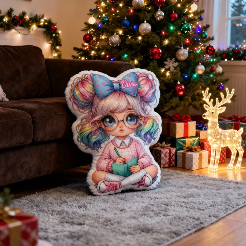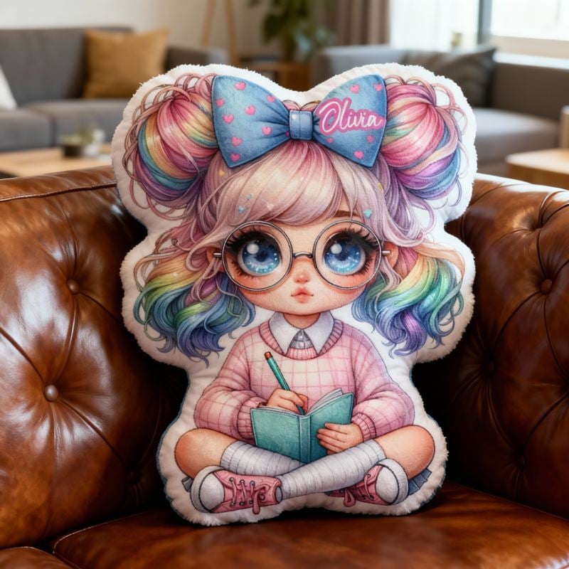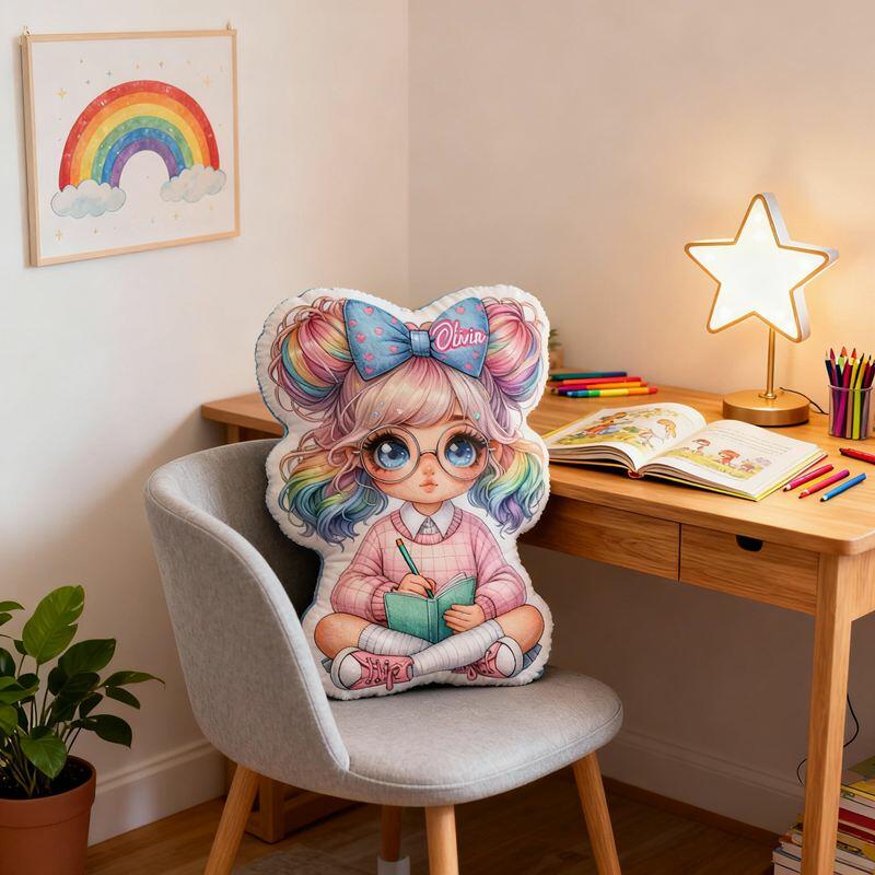 Personalisiertes Kissen in Cartoon-Form Design mit süßem Mädchen mit bunter Schleife im Haar Geschenk für Mädchen