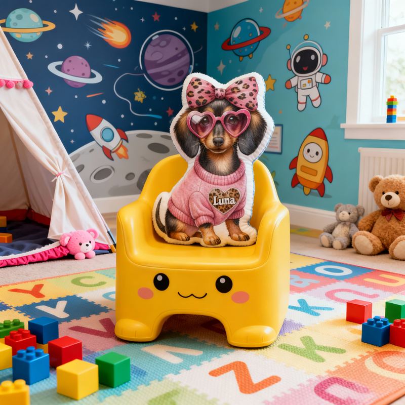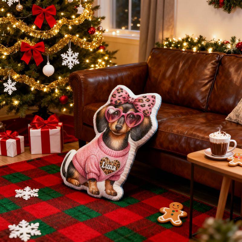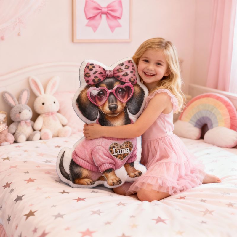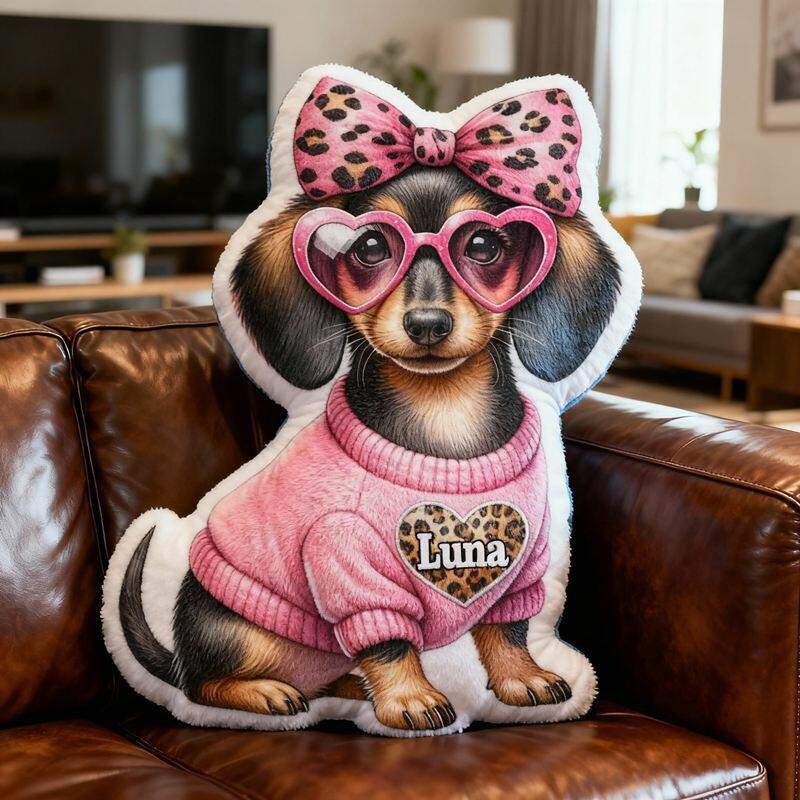 Personalisiertes Kissen in Cartoon-Form mit Dackel in rosa Leopardenoutfit schickes Design Geschenk für Kinder
