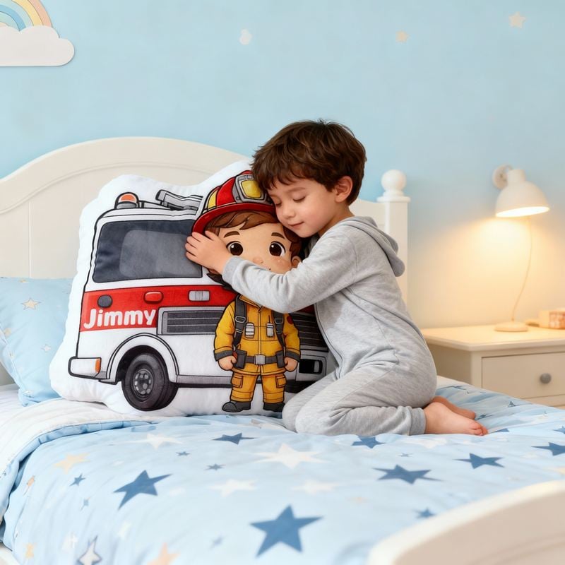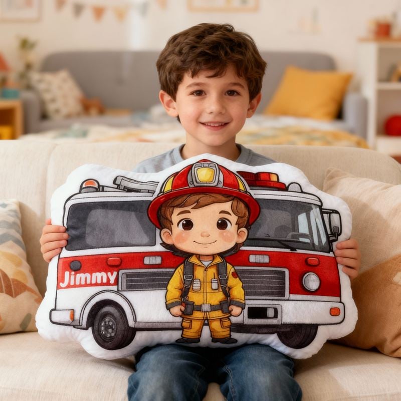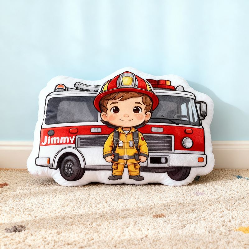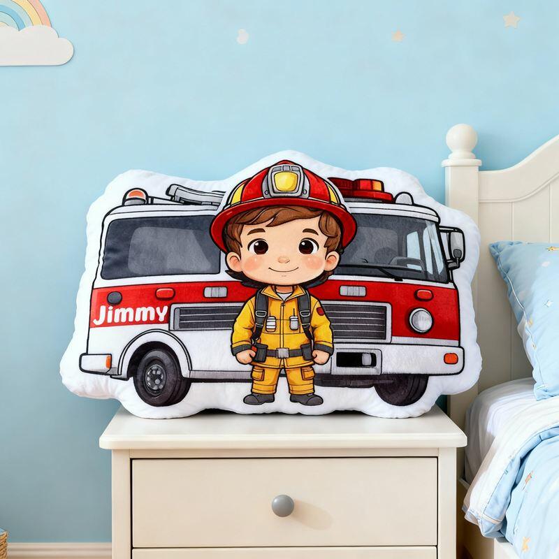 Personalisiertes Kissen in Cartoon-Form mit Feuerwehrmann- und Feuerwehrauto-Motiv cooles Geschenk für Kinder