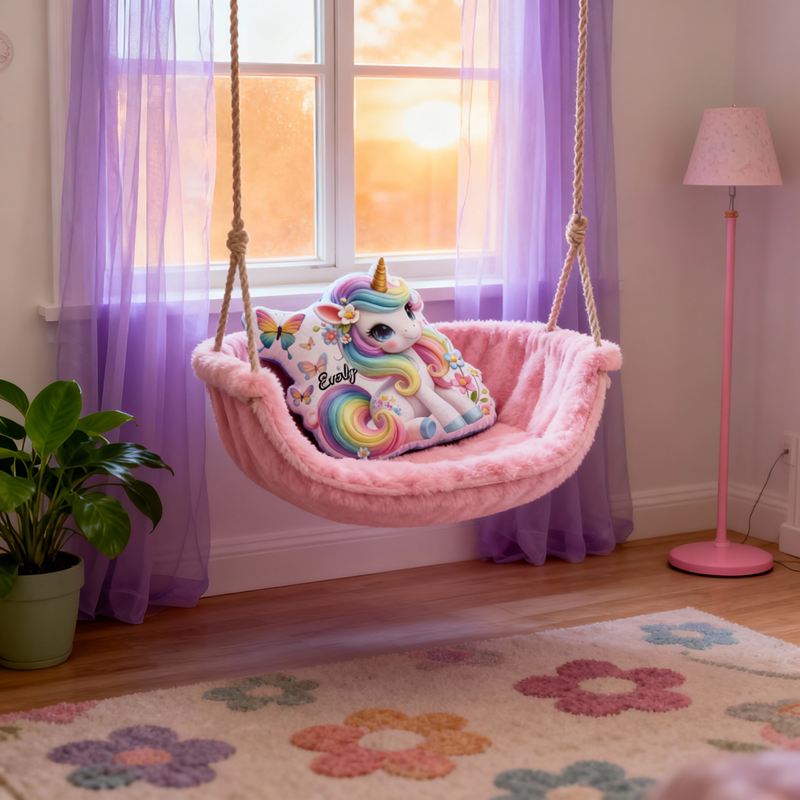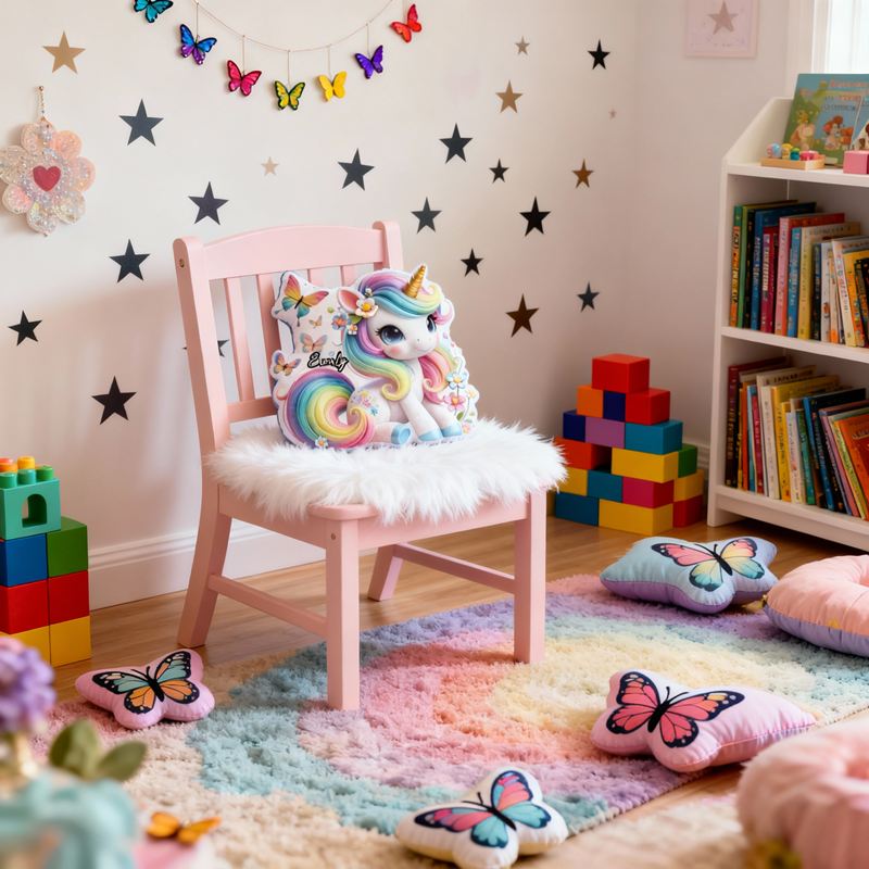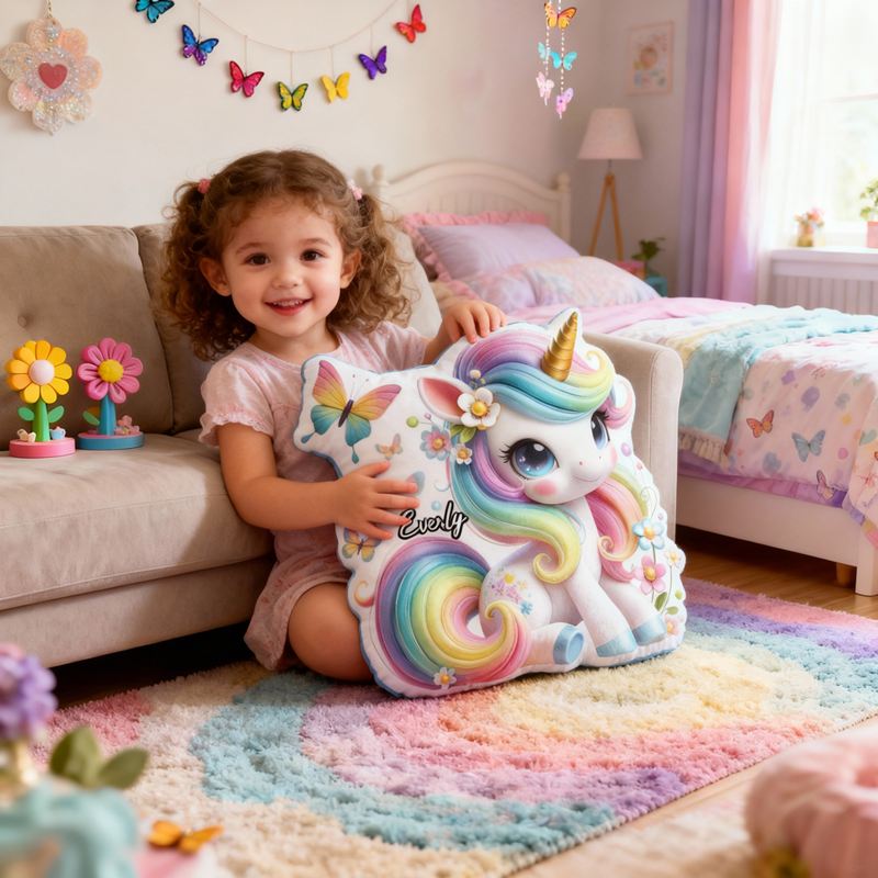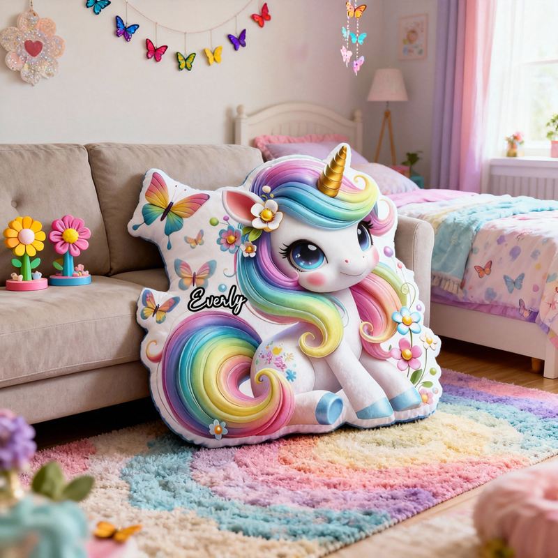 Personalisiertes Kissen in Cartoon-Form mit Regenbogen-Einhorn und Blumen-Schmetterlings-Design niedliches Geschenk für Mädchen