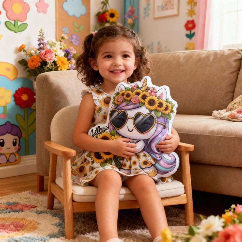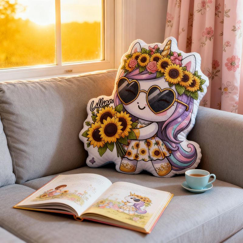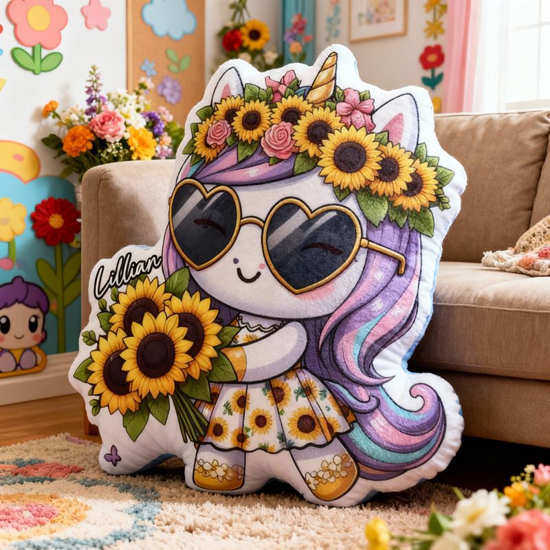 Personalisiertes Kissen in Cartoon-Form mit Sonnenbrille Einhorn und Sonnenblumen-Motiv ein niedliches Geschenk für Mädchen