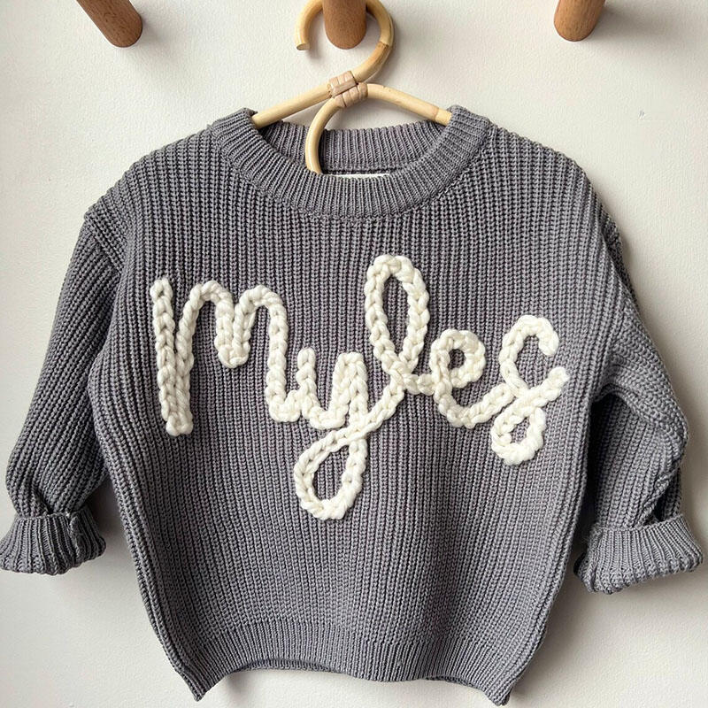Personalisierter handgefertigter Namenspullover mit weißem Text Design Geschenk für hübsches Baby