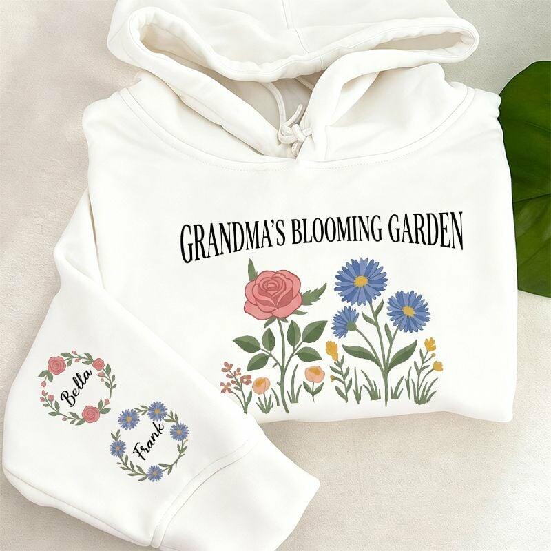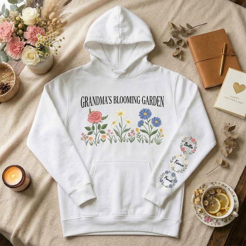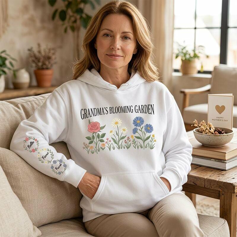 Personalisierter Hoodie mit individuellem Blühender Garten-Motiv und Kranz aus Geburtsblumen Geschenk zum Muttertag