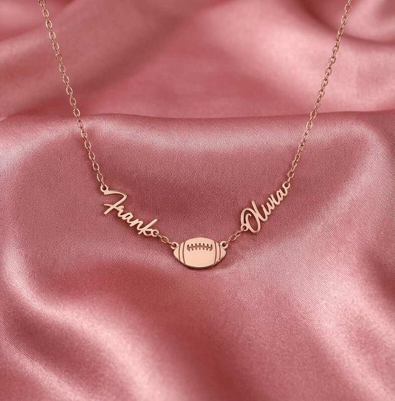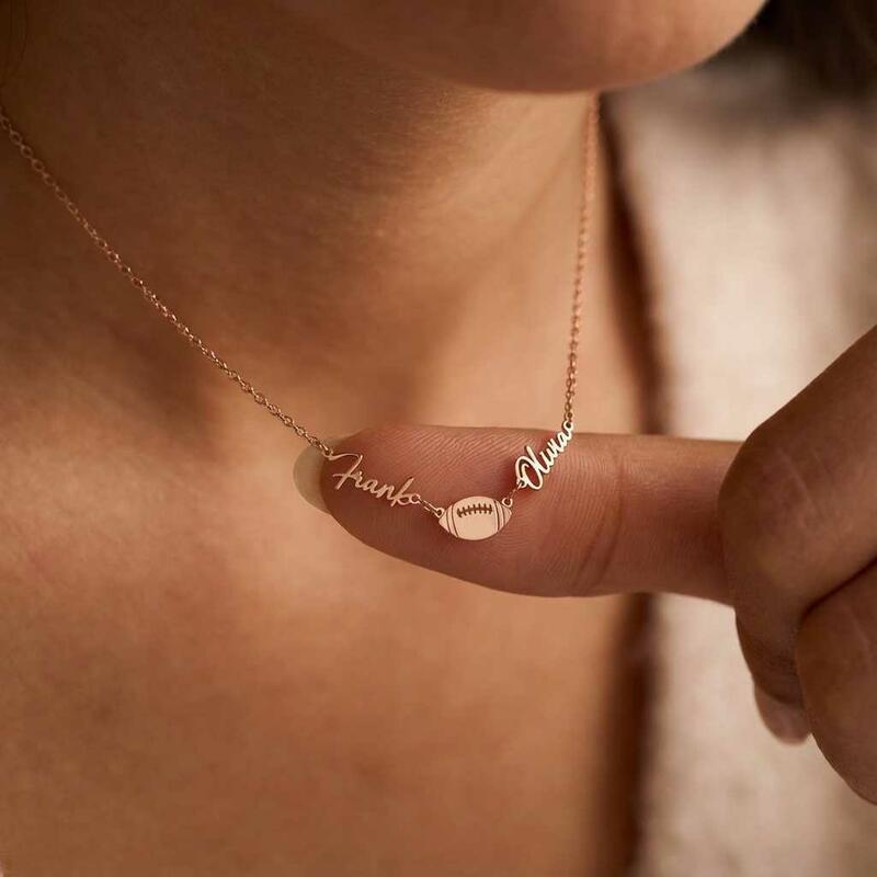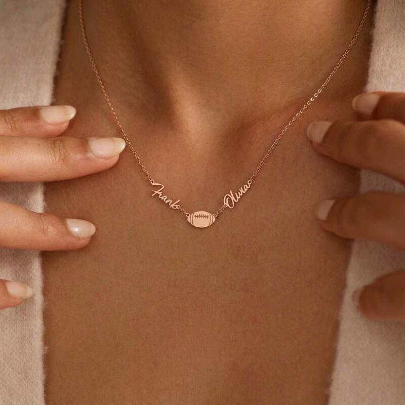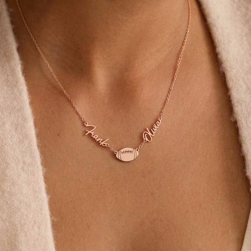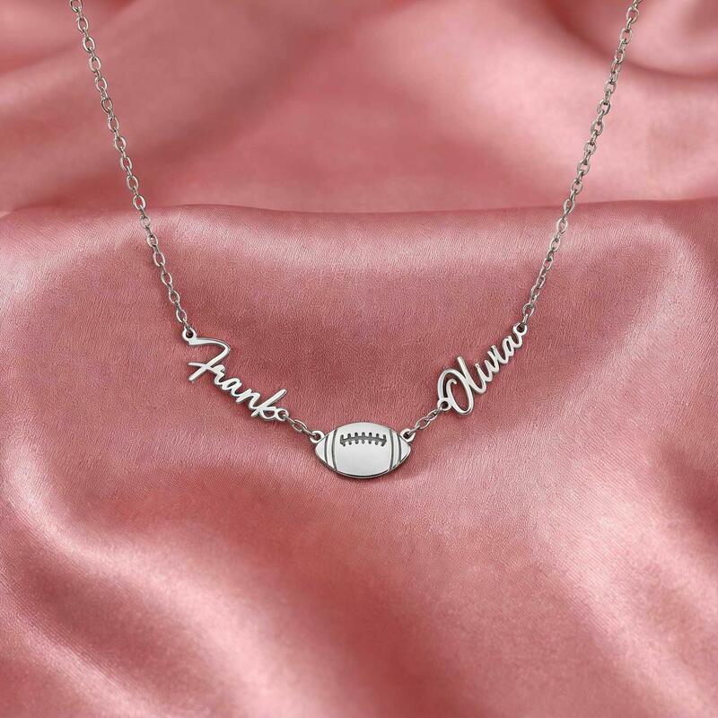 Personalisierte Halsketten mit den Namen des Paares und einem Rugbyball-Design ein Geschenk für Sportliebhaber