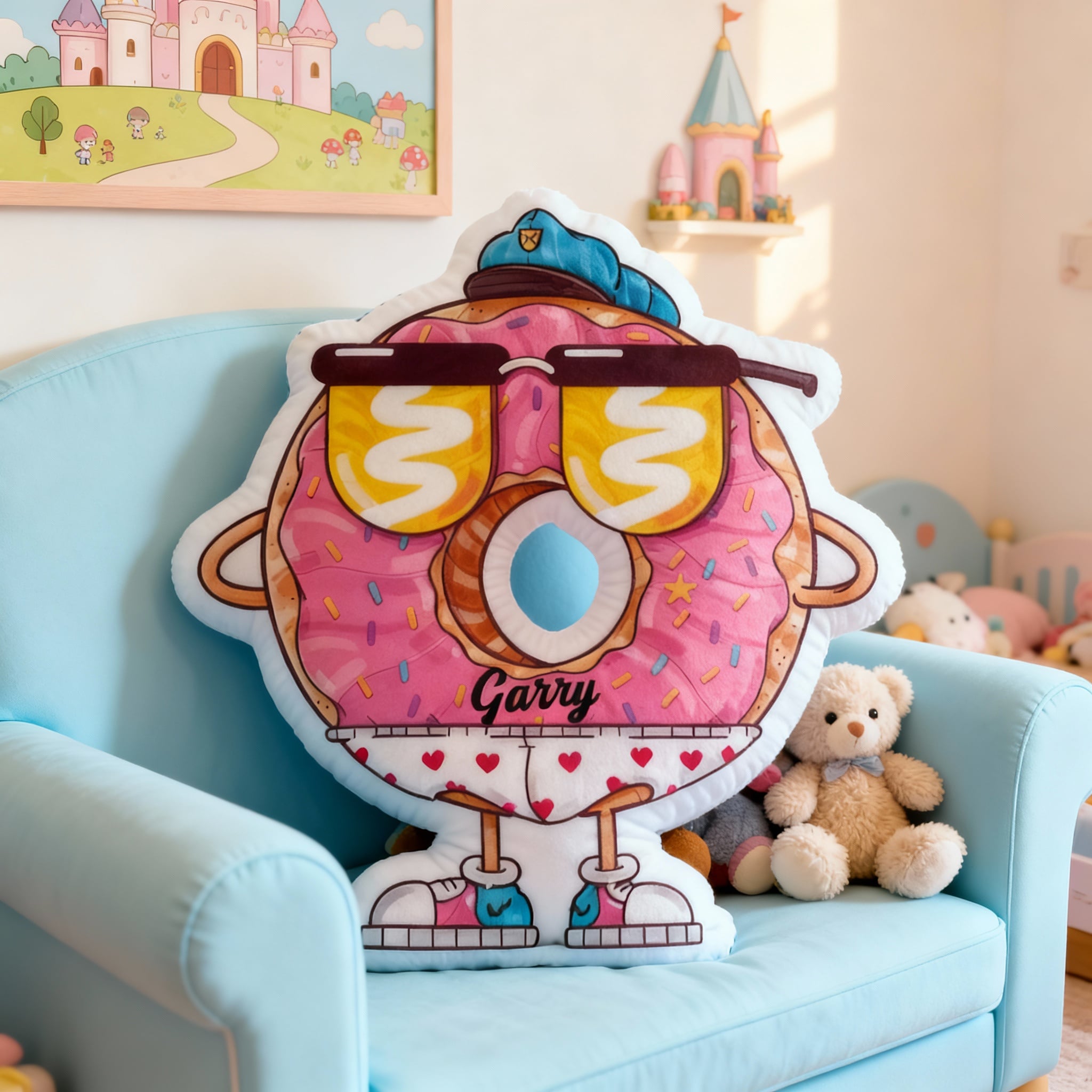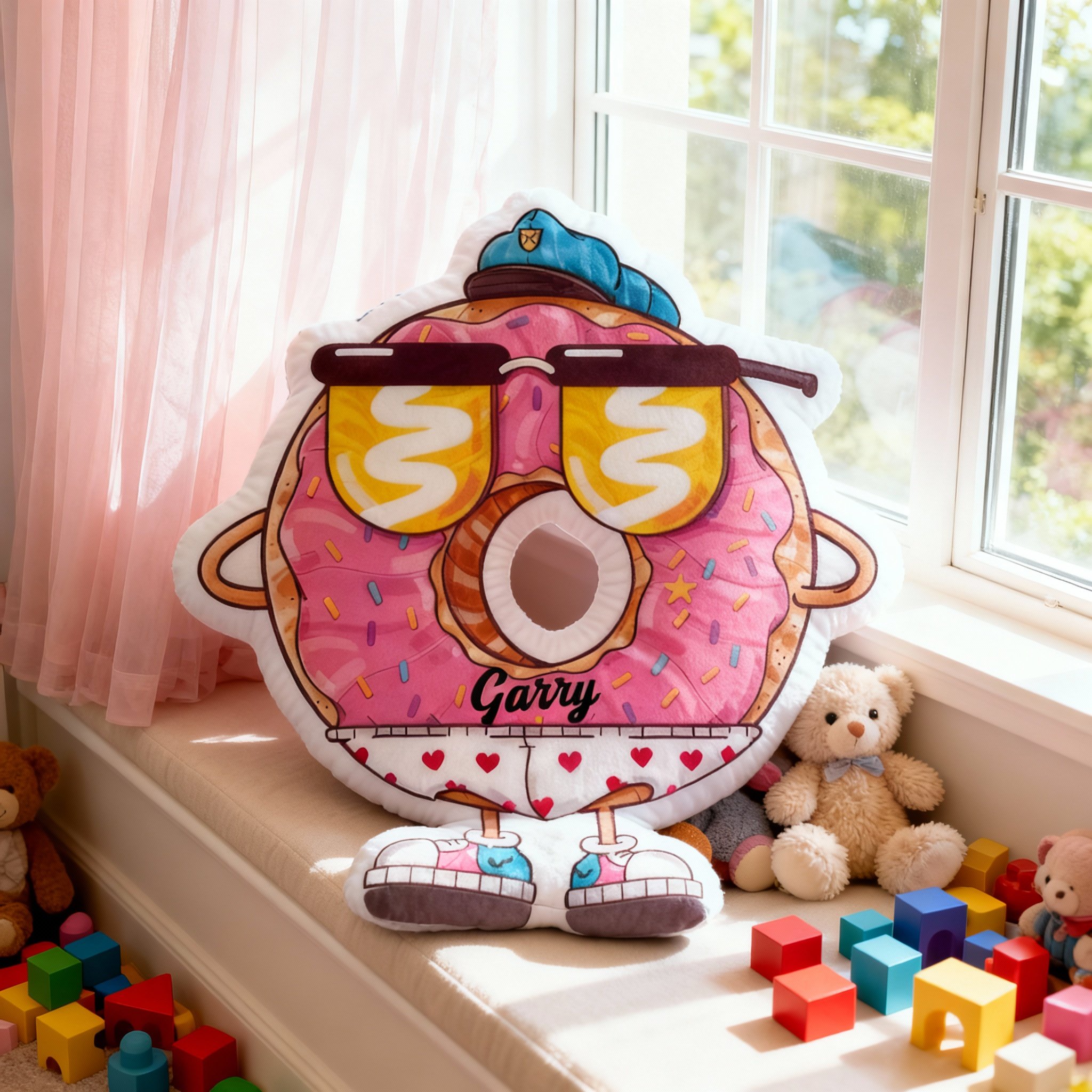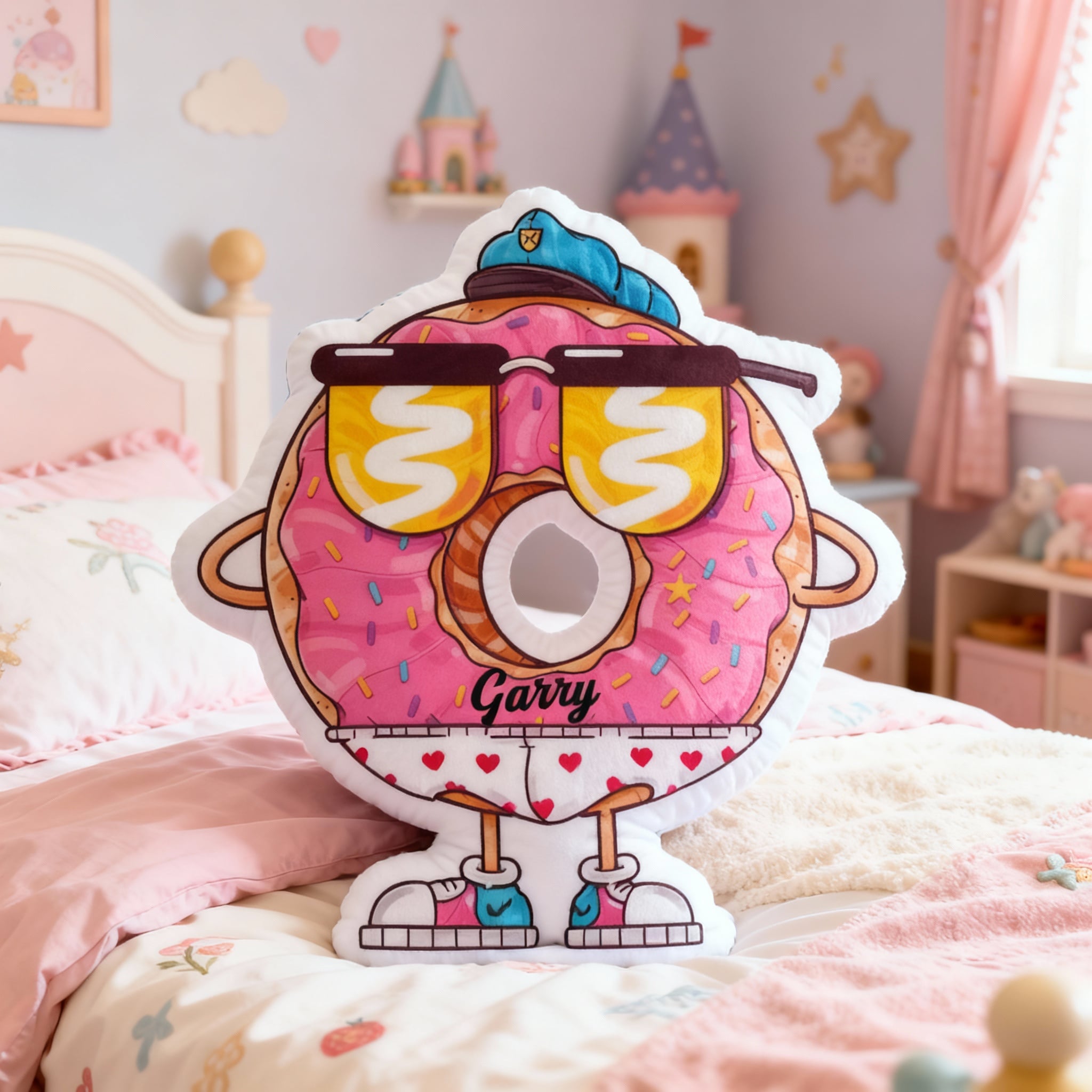 Personalisiertes Sonnenbrillen-Donut-Kissen individuell mit Ihrem Namen gestaltbar süßes Geschenk für Kinder