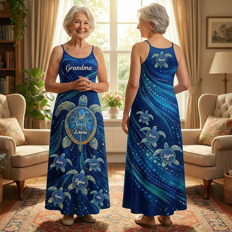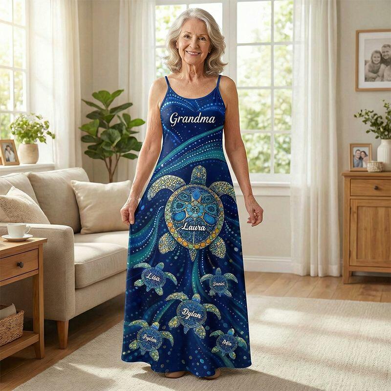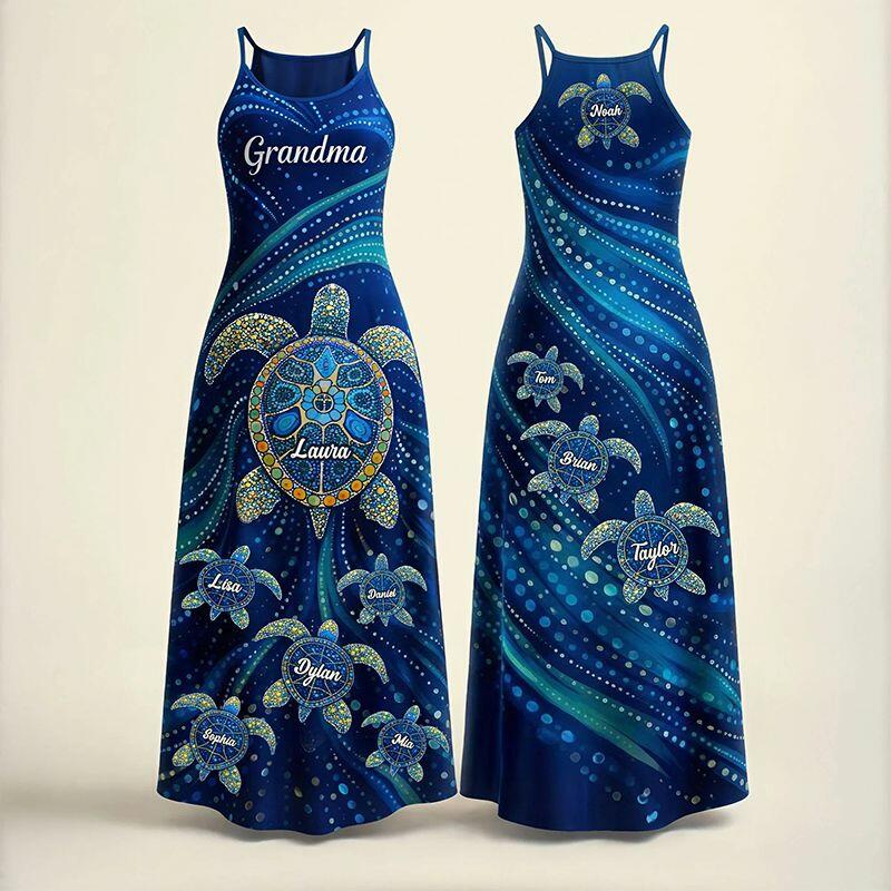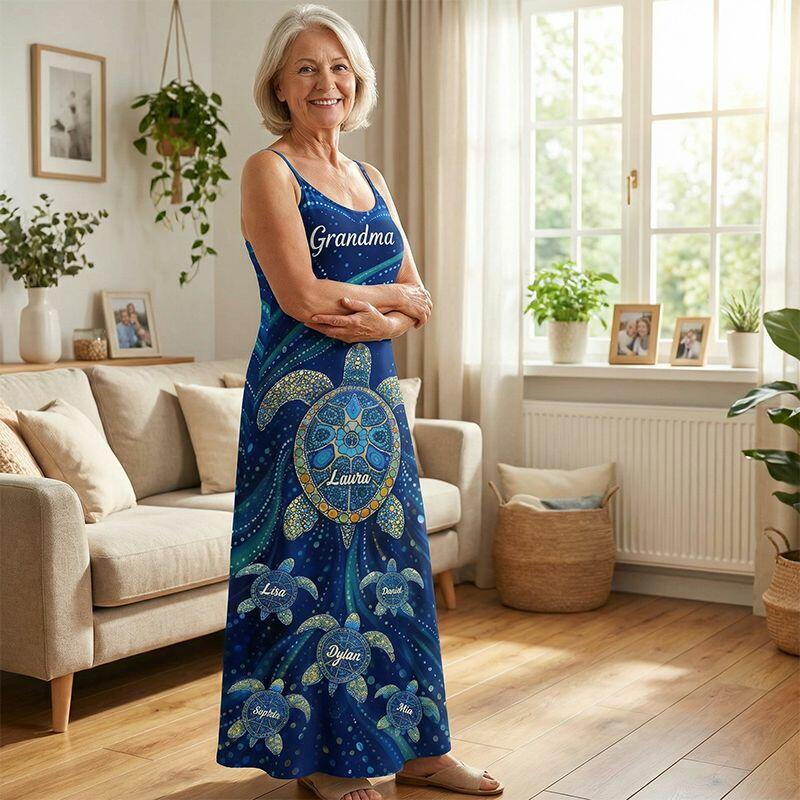 Personalisiertes Maxikleid mit Trägern individuelles Schildkröten-Design für Oma Retro-Blau Geschenk zum Muttertag