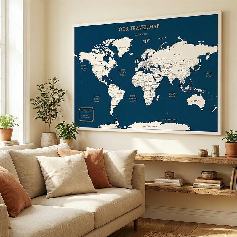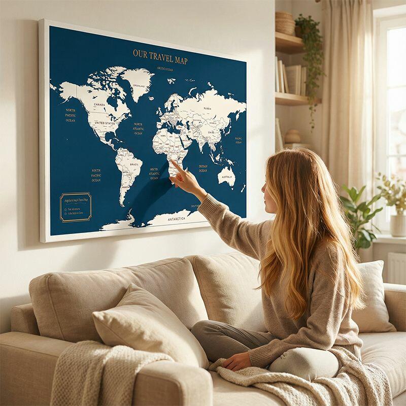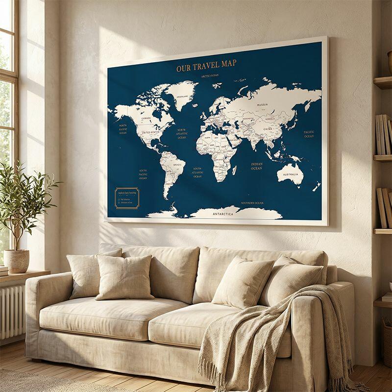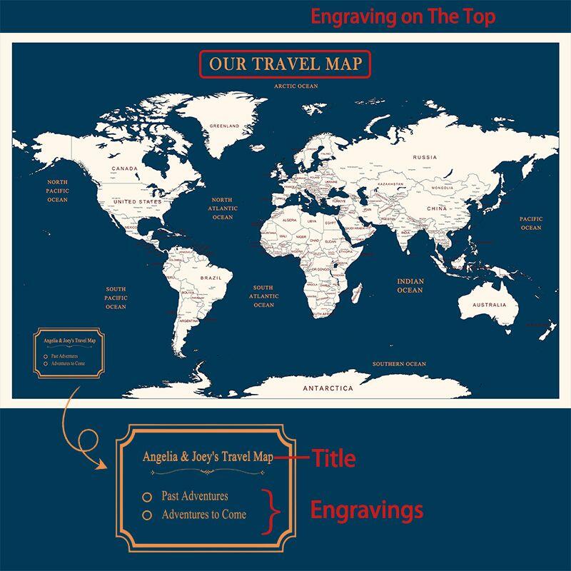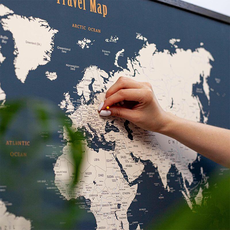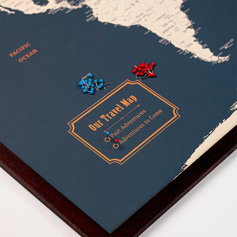 Personalisierte Wanddekoration aus Leinwand mit Reisekarte und Stecknadeln Weltkarten-Design Das perfekte Geschenk für Reiseliebhaber